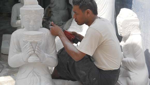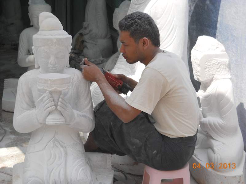In Mandalay gibt es eine lange Strasse in der die Marmorschleifer ihrem Handwerk nachgehen. Steigt man aus dem Bus hält man schon automatisch den Atem an. Der weisse Schleifstaub liegt in der Luft. Ohne Staubmasken bearbeiten die Männer den Marmor mit Schleifmaschinen. Es werden vorwiegend Buddhafiguren hergestellt. Diese sieht man in allen Größen. Kleine, die man als Souvenir erstehen kann, aber auch riesige Figuren, die für Pagoden in Auftrag gegeben werden. Zwischen den Marmorschleifern gibt es auch viele Verkaufsstände wo man Buddhafiguren oder auch Jadeschmuck erstehen kann.