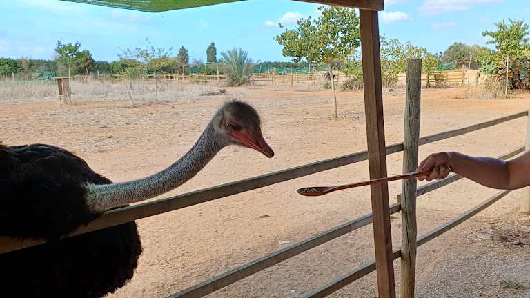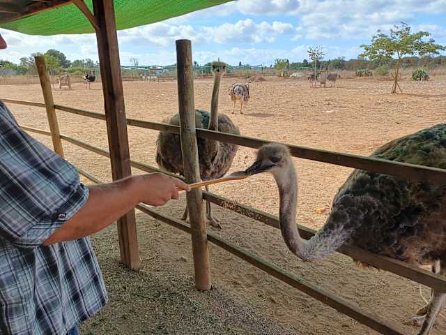 Die Straußenfarm liegt außerhalb von Campos. Wir sind mit dem Mietwagen hingefahren, kostenfreie Parkplätze sind ca. 100m vom Eingang entfernt vorhanden. Wir waren direkt morgens kurz nach Öffnung dort und waren die ersten Besucher, später kamen noch weitere Besucher, vor allem Familien mit Kindern, aber es blieb überschaubar. Wir wurden sehr freundlich begrüßt, auf Englisch wurde uns alles erklärt. Der Eintritt hat für einen Erwachsenen 17,50 p.P. betragen. Inklusive ist ein Korb mit Gras/Kräutern, sowie eine Schale mit Körnern, hiermit kann man die Tiere füttern. Wir haben uns ca. 1 Stunde dort aufgehalten. Es gibt auch ein Cafe, sowie einen kleinen Shop/Museum. Die Farm wird familiär betrieben, man merkt, dass alle viel Freude daran haben und sich auch darüber freuen Fragen zu beantworten. Ich fand es ein einmaliges Erlebnis so nah an die Tiere gelangen zu können und kann einen Besuch der Farm auf jeden Fall empfehlen, hier kommen nicht nur Kinder auf ihre Kosten.