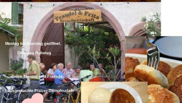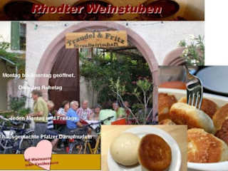 Es gibt sie noch! ........Die gute, alte Straußwirtschaft; kein "Schnick-Schnack" sondern Pfälzer Hausmannskost! * PfäzerSchoppen" * Pfälzer Hausmannskost * Montag und Freitag Dampfnudeln * ein Viertel Wein unter 3,00 € * „Grumbeeresupp un Quetschekuche“ also Kartoffelsuppe und Pflaumenblechkuchen diese Zusammenstellung erscheint auf den ersten Blick etwasfremdartig. Zur Zeit der Zwetschgenernte ist sie jedoch in der Pfalz, im Elsassund in Baden sehr beliebt. Traudel & Fritz Straußwirtschaft 76835 Rhodt - Theresienstrasse www.ferienwohnung-rhodt.de Wir gehen gerne mit unseren Hausgästen zu "Traudel & Fritz.