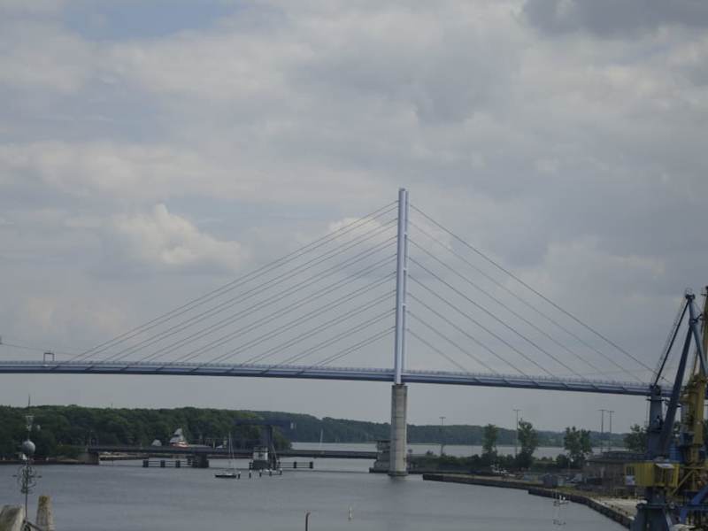 Mit diesem Begriff werden 3 Verbindungsmöglichkeiten zwischen dem Festland und der Insel Rügen möglich, nämlich die neue Rügenbrücke, der Rügendamm sowie die Fährverbindungen. Der RÜGENDAMM ist die erste feste Überquerung mit der Straße, sowie die einspurige Eisenbahnlinie von Stralsund nach Sassnitz und der kombinierte Fuß- und Fahrradweg. Fertig gestellt wurde der Rügendamm in den Jahren 1936 / 37. Die Neue RÜGENBRÜCKE wurde fertig gestellt im Jahr 2007, sie ist die größte Schrägseilbrücke in Deutschland, sie ist weiter nur für den Kraftverkehr zugelassen. Beide Brückenobjekte werden parallel betrieben. Die Rügenbrücke besteht aus 7 Bauabschnitten, 5 sind Brücken-Bauwerke, 2 davon sind die eigentlichen Brücken über den Sund. Zur Überquerung gehört dann auch noch der Fährbetrieb der zur Zeit von der Weissen Flotte betrieben wird. Geht man in die Historie, sollte man wissen, daß Rügen schon seit Jahrtausenden besiedelt wurde, aber der Strelasund war dann für die Leute, die auf dem Festland lebten, ein Hindernis, dort hinzu gelangen. Die Rügener hatten schon vor 7 tausend Jahren ihre Heiligtümer und Opferaltäre in den Wäldern des Jasmund. Viele Leute die aber auf dem Festland lebten, mußten dann mit Booten rüberpaddeln. Die Meerenge zwischen Stralsund und dem Ort Altefähr ist dort am wenigsten breit. Um die Jahre 1000 und 1100 entwickelte sich ein Fährbetrieb, denn schon damals wurde der Handel mit Heringen stärker. Nachdem die Dänen dann christianisiert waren, wurde dort ein Fährbetrieb für den Handel eingerichtet. Wir haben die beste Aussicht auf die neue Brücke von der Nordmole gehabt, um Fotos zu machen.