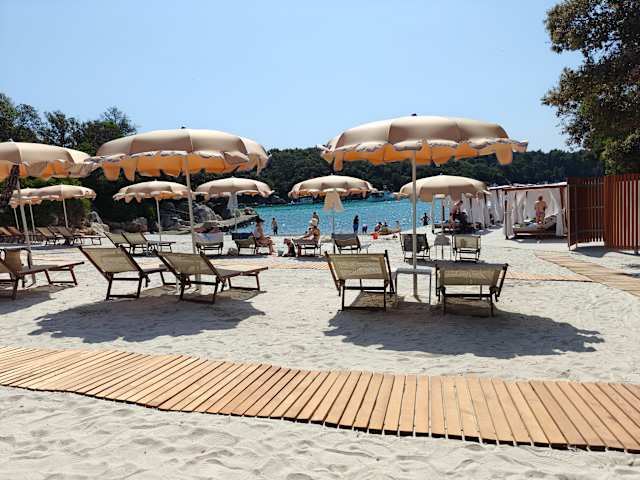 Der Suha Punta Beach ist direkt unterhalb des Hotel Eva in Suha Punta. Geparkt werden kann unmittelbar an dem Hotel, von dem aus man dann noch ca.5 Minuten zum Strand laufen muss. Empfohlen wurde uns dieser Strand von der einheimischen Vermieterin unseres Ferienhauses. Sie meinte zu uns, dass dieser Strand nicht so extrem überfüllt sei von Touristen und dass das Wasser sehr klar sei, was in der Tat auch so war. Angekommen am Strand staunten wir auch erst einmal nicht schlecht, denn das Wasser war in der Tat türkisfarben und kristallklar. Was den Strand in Suha Punta von den meisten anderen auf der Insel Rab unterscheidet ist die Tatsache, dass man hier weder einen Sand- noch Kiesstrand vorfindet. Der Strand ist eher eine Bucht, wo man entweder direkt auf den Felsen/Klippen liegen kann, oder ein einer Art Wald sein Quartier aufschlägt. Empfelenswert ist es hier, entweder eine Liege oder ein etwas dickeres Handtuch mitzunehmen, da man wirklich teilweise auf einem Waldboden mit Wurzeln, Ästen und Erdboden liegt, was aber nicht weiter schlimm ist. Durch die Bäume hat man Schutz vor der Sonne und möchte man doch etwas mehr Sonne haben, so kann man entweder etwas weiter vor auf einen Liegewiese, oder aber man kann auf die Felsen direkt am Wasser liegen. Gebadet wird direkt in der Bucht, wo man von den Felsen direkt ins super klare und tiefe Wasser springen kann. Dank den vielen Felsen kann man auch super schnorcheln gehen und kann eine Vielzahl von Fischen, Krebsen und Seeigeln sehen. Letztere sind hier aber leider etwas zu häufig vertreten, sodass ich es doch sehr empfehle nur mit Badeschuhen ins Wasser zu gehen. Ebenfalls super ist die Tatsache, dass es in direkter Nähe zwei Lokale gibt,in welchen man etwas essen, bzw. etwas trinken kann. Vorteile: - Extrem klares Wasser, tiefes Wasser - Bewirtschaftet (Beach Bar Del Mar) - Super Aussicht und tolle Natur - Sanitäranlagen Neutral: - Weder Kies noch Sandstrand - Felsenbucht Nachteile: - Sehr viele Seeigel Fazit: Der Strand in Suha Punta ist vielleicht nicht der typische Strand wie man ihn sich vorstellt, jedoch ist das Wasser ein Traum. Mit gewissen Vorbereitungen ist auch das liegen im Wald kein Problem und durch die Bäume ist man ideal von der brennenden Sonne geschützt. Ideal für sonnenstrapazierte Haut.