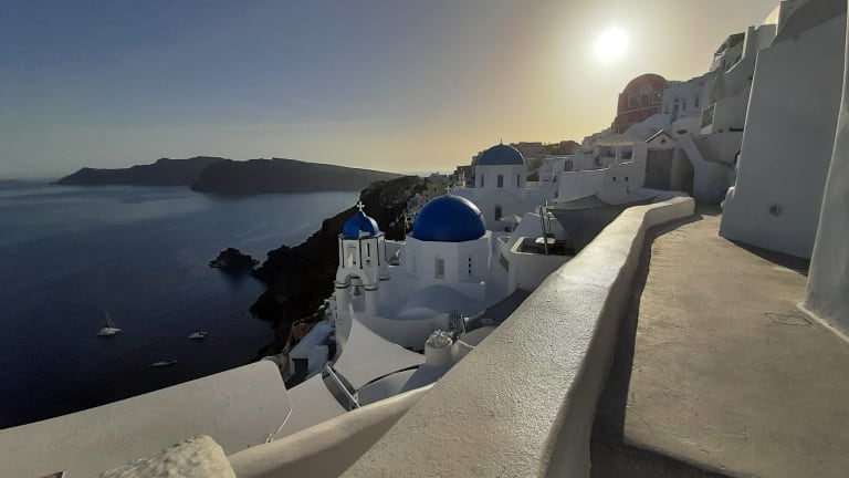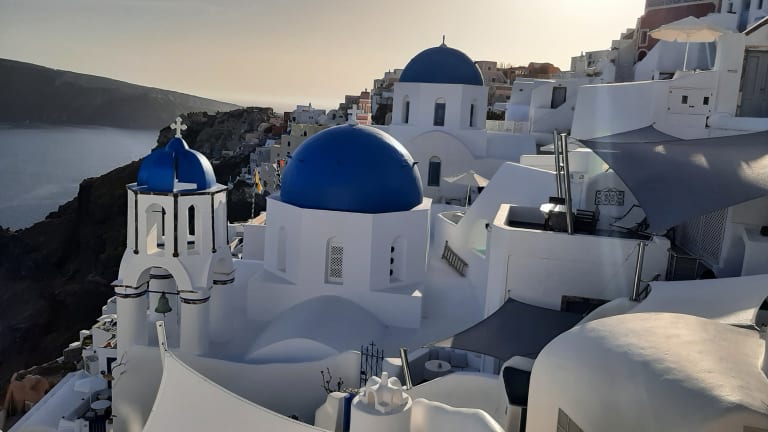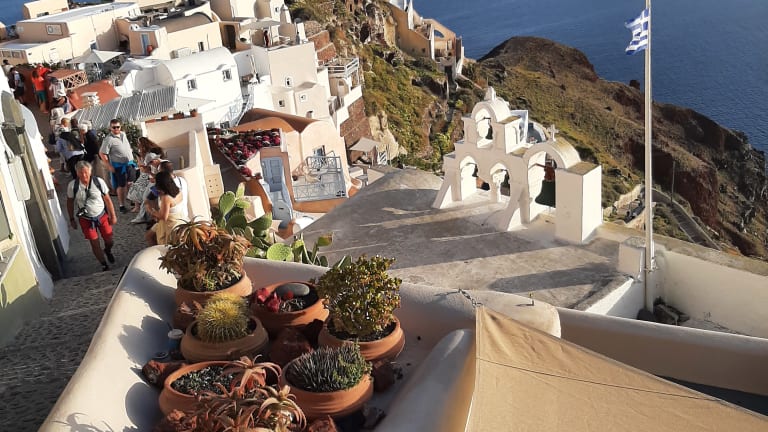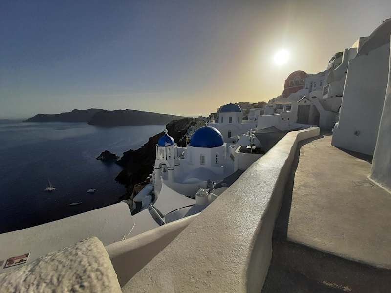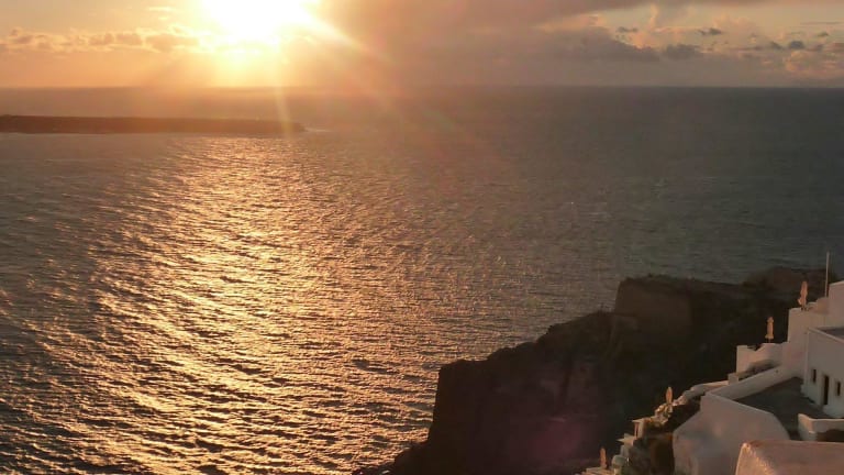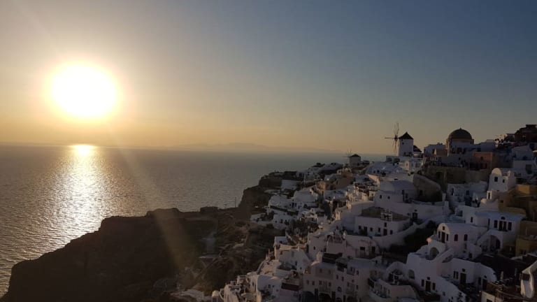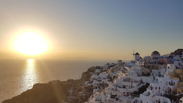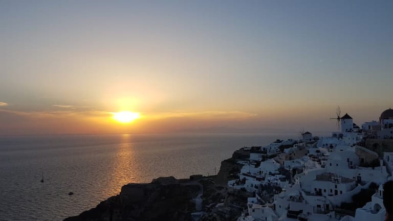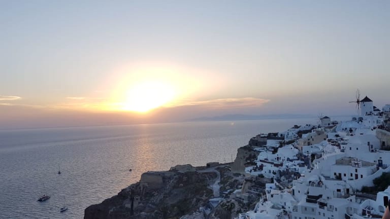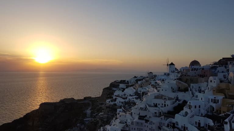 Hunderte von Menschen sitzen auf Steinmauern, Treppen und Dächern der kleinen Häuschen im Dorf Oia und beobachten den Sonnenuntergang. Einer spielt Gitarre, ein anderer singt, viele trinken Wein und wenn das letzte Stückchen Sonne im Meer versunken ist, bedanken sich alle mit einem Applaus und rufen "Danke" in ihrer Landessprache! Ein traumhaftes Erlebnis!