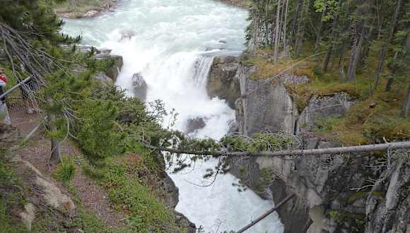 Der Sunwapta Wasserfall ist ca. 60 km südlich von Jasper über den Icefield Parkway auf erreichbar. Er ist insgesamt etwa 18 Meter hoch und rund neun Meter breit. Das Wasser des Sunwapta River stammt vom Athabasca Glacier und fällt hier in zwei Stufen hinab. In der Sprache der Indianer bedeutet Sunwapta „reisendes Wasser“. Hinterher wussten wir die Athabasca Falls, 20 km weiter in Richtung Jasper, sind eindrucksvoller. Uns hat es aber trotzdem gefallen.