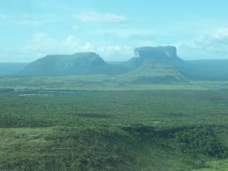 Wer eine Tour durch die Gran Sabana unternimmt, für den ist Santa Elena die letzte Station. Wer dann nicht nach Brasilien weiter reisen will, hat die Wahl, entweder auf demselben Weg zurück Richtung Puerto Ordaz / Ciudad Bolívar zu fahren oder mit einem Kleinflugzeug nach Canaima zu fliegen. Die Flugroute führt dann automatisch an den tepuyes vorbei. Wer letzteres wählt, muss bereits Monate im Voraus den Flug buchen lassen. Das geht am besten, wenn man bei einer Reiseagentur eine Kombinationstour aus Gran Sabana und Canaima bucht. Diese Variante haben wir gewählt. Obwohl unsere Flüge auch Monate vorher reserviert waren, war es bis zu Beginn unserer Gran Sabana Tour spannend, denn die Flugbestätigung kam erst eine Woche vor dem besagten Abflug. Es ist nie sicher, ob überhaupt eine Maschine eingesetzt wird, denn für die Gesellschaft lohnt sich der Einsatz meistens nur, wenn etwa 4 Passagiere mitfliegen. Auch in Santa Elena selbst war es spannend, denn der Flug hätte wetterbedingt oder aus sonstigen Gründen ausfallen können. Das war bei uns zum Glück nicht der Fall, ein Rest an Spannung war nur die Uhrzeit des Abfluges, so dass keiner wusste, wie lange man als Passagier warten musste. Der Check-In ist sehr unkonventionell: Ein Soldat der Nationalgarde überprüft die Pässe und Flugtickets und notiert sämtliche Daten auf verschiedenen Listen. Danach wird die Flughafensteuer (ca. € 1, 00) bezahlt. Normalerweise ist das Freigepäck auf 10 kg begrenzt, für jedes Kilo Übergewicht wird US$ 1, 00 berechnet, aber wir hatten Glück. Es passiert nicht alle Tage, dass man wie wir in ein Flugzeug steigt und der Pilot einen mit Handschlag begrüßt. Die Verteilung auf die Sitze übernimmt der Pilot. Das Kriterium dabei ist das Körpergewicht. So sitzen die leichtesten bzw. dünnsten Passagiere ganz hinten und der dickste darf Co-Pilot spielen (ohne Kopfhörer). Der Flug bescherte uns eine Wahnsinnsaussicht. So viele tepuyes bekamen wir auf einen Blick zu sehen!! Aus ferner Sicht sind sich die tepuyes von der äußeren Struktur bzw. vom Aufbau her ähnlich: Zuerst klettert der Regenwald trapezförmig den Sandstein bis zu einer Höhe von 1. 000 Metern hoch. Ab dieser Höhe kann kein Erdreich mehr haften, so dass sich nur noch kahler roher Granitfels in die Höhe erstreckt. Etliche tepuyes ragen mit ihren reinen Felswänden über 1. 500 bis fast 2. 000 Meter über den Regenwald hinaus. So erreicht der z. B. Roraimatepui inklusive seines Regenwaldbestandes eine Gesamthöhe von über 2. 900 Metern. Es ist atemberaubend diese Naturwunder zu betrachten, die von der Höhe her es mit fast jedem Berg in Deutschland locker aufnehmen können. Teilweise wirken sie recht putzig, vor allem die kleineren tepuyes, die inklusive ihrem Regenwaldbestand von weitem wie Felsklötzchen mit grünem Röckchen aussahen. Einen direkten und sagenhaften Blick auf die kleineren tepuyes konnten wir bei unserer Zwischenlandung in Wonkén, einer Indianersiedlung, die nur per Flieger zu erreichen ist, genießen. Wir standen in freier Natur – sogar die Landebahn war eine holprige Gras- und Erdpiste, die man zum Teil eher vermuten als sehen konnte – und vor uns die Tafelberge, die selbst auf einer Distanz von 5 km bombastisch und riesig wirkten, selbst wenn es nur die „kleineren Ausgaben“ waren. Der Weiterflug wurde spannender. Unter uns der undurchdringliche Regenwald, der wie ein niemals endender grüner Teppich aussah und nur durch den einen oder anderen ein Schwarzwasserfluss unterbrochen wurde. Aus der Flugperspektive sah der Fluss mit seinen Biegungen wie eine schwarze Schlange auf grünem Grund aus. Weit und breit keine Siedlung zu sehen. Der Auyantepui, auf den wir ein wenig später trafen, erweckte in uns mit seiner Größe und über 2. 400 Metern Höhe mehr als einen großen Eindruck, uns lief ein Schauer über den Rücken. Mit seinen 700 km² ist er auch optisch niemals mit einem Blick zu erfassen. So bekommt man vielleicht ein Zehntel des majestätischen Massivs auf einmal zu sehen. Dabei weist er viele Biegungen, Windungen und breite Schluchten auf. Er wirkt mit seinen bizarren Felsformationen teilweise wie eine düstere und uneinbringbare Festung, so dass wir bei seinem wechselnden und facettenreichen Anblick Ehrfurcht verspürten. Irre war auch der Anblick von oben auf die verschiedenen Wetterfronten, die den Auyantepui umgaben. Wurde ein Teil des tepuyes von der Sonne beschienen, so befand sich 5 km weiter eine dicke Regenfront, die den Abschnitt des tepuyes wie ein dichter Vorhang verdeckt. Dieses zur gleichen Zeit zu beobachten zu können, war einmalig. Ein weiteres Highlight waren die letzten 10 Minuten unseres Fluges als der Pilot ganz aufgeregt auf einen Wasserfall deutete, der etwa 15 bis 20 km von der rechten Seite des Flugzeugs entfernt auftauchte. Es war der Salto Angel, dessen Fall wir zum Teil erkennen konnten, zumindest den vom Plateau des Auyantepuis aus, wie das Wasser ein paar hundert Meter hinunter schoss und dann jedoch aus unserer Perspektive hinter einen Granitblock verschwand. Leider dürfen nur sehr wenige Flugzeuge durch die entsprechende Schlucht fliegen, in der der Salto Angel frontal in seiner Länge zu sehen ist. Dieses ist nur Gesellschaften, die Rundflüge von Canaima aus anbieten, gestattet. Das ist auch verständlich und immerhin bekamen wir auf unserer Boots- und Wandertour am nächsten Tag den Salto Angel aus nächster Nähe zu sehen. Der Anblick aus der Luft erhöhte unsere Vorfreude. Der Flug von Santa Elena nach Canaima in einer Cessna ist kein Flug für ängstliche Leute oder Leute mit sensiblen Mägen. Das Wetter ist nicht immer beständig, es kommt vor, dass das Flugzeug von einer Minute auf die andere in eine Regenfront gerät. Der Pilot versucht zwar, diese so weit wie möglich zu umfliegen, aber manchmal kann er ihr nicht ausweichen. Hinzu kommt, dass der Wind ziemlich heftig gerade durch die Schluchten des Auyantepuis pfeift. Dieses bekommt man auch im F