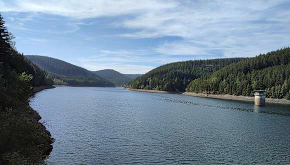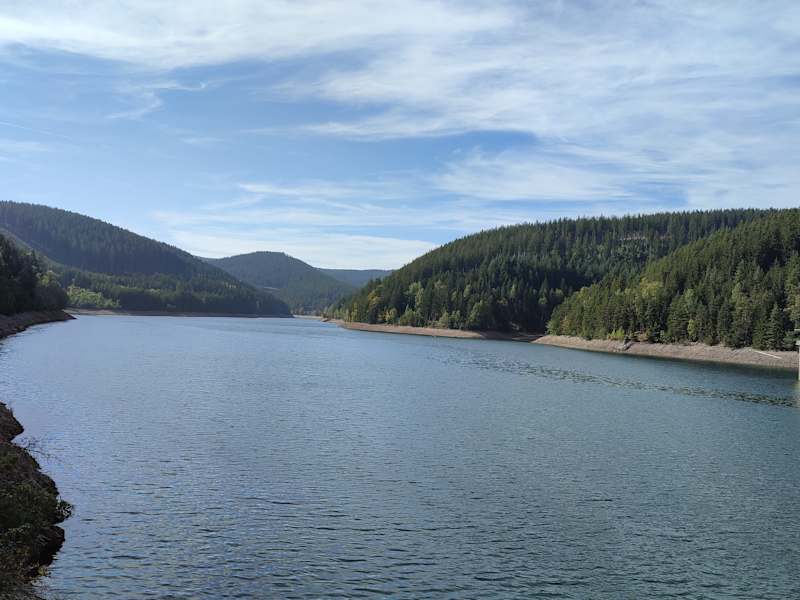 Dieser Stausee ist eine rein technische, gut abgeschirmte Einrichtung. Der geneigte Wanderer wird dort (Ostseite) nicht bemerken, an einem Stausee zu wandern. Die Wanderwege dort haben nichts mit diesem See zu tun. Einige wenige Blicke auf kleine Teile des Sees aus der Ferne sind möglich. Sonnen-Entspannen" kann man sicher anderswo viel besser als dort. In Wassernähe befindet man sich dort höchstens auf der Staumauer.