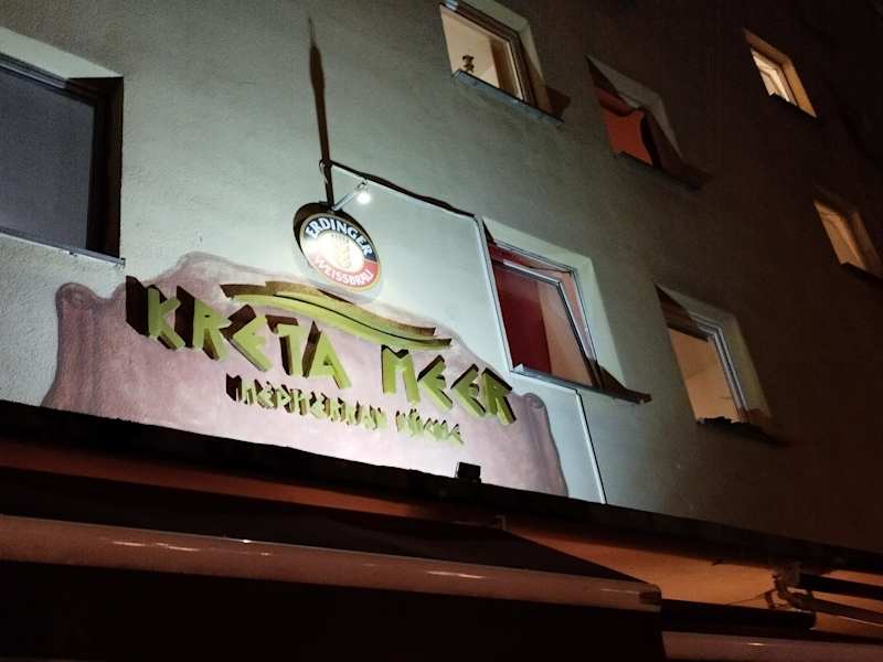Ende Oktober waren wir mit 8 Personen bei einer Familienfeier im Restaurant Kreta Meer. Das Restaurant befindet sich in der Moosacher Str. 81. Bereits im Eingangsbereich wird auf den Hinweisschildern des Restaurants auf die Mediterrane Küche hingewiesen. Die Auffassung, dass die mediterrane Küche gesund ist, verdankt sie vor allem drei Essgewohnheiten in den Mittelmeerländern: Dem hohen Konsum an Olivenöl, dem Verzehr von viel frischem Obst und Gemüse und dem Verzehr von viel Fisch aufgrund der Nähe des Meeres. Da das Restaurant sehr bekannt im Stadtviertel Milbertshofen ist, haben wir vorher telefonisch reserviert. Die Reservation klappte einwandfrei. Wir hatten einen sehr ruhigen Ecktisch für 8 Personen im Gastraum. Die sehr freundliche und aufmerksame Bedienung brachte uns sofort die Speise- und Getränkekarte. Die Auswahl fiel uns sehr schwer. Wir bestellten uns 2 mal Panierte Calamares mit Ofengemüse, 1 mal Gegrillte Rinderleber mit Gemüsereis, 1 mal Baby Calamares mit Ofengemüse, 1 mal Gegrilltes Hähnchenbrustfilet mit Gemüsereis, 1 mal Panierte Zucchinischeiben, 1 mal Gyros und 1 mal Gyros mit Calamares. Als Nachspeise bestellten wir für unsere Enkelkinder noch ein Gemischtes Eis mit Sahne. Die Weinkarte war sehr ausgewogen und bietet für alle Weinfreunde etwas. Als Getränk bestellten wir u.a. folgende Schoppen Weine - Athos weiß, Merlot und Retsina. Die Speisen und Getränke wurden uns nach kurzer Zeit gebracht. Die meisten Gerichte waren schmackhaft und reichlich. Leider war meine Rinderleber etwas zu zäh und das Ofengemüse von meiner Schwägerin war nach ihrem Geschmack zu kalt. Zum Abschied gab es noch zwei Ouzo für jeden Erwachsenen aufs Haus und eine persönliche Verabschiedung vom Chef persönlich. Erwähnenswert sind auch einige schönen Wandbilder und Wandtafeln. Auf einer Wandtafel war folgender netter Text zu lesen: „ Die Wahrheit ist wie Du kannst sie für eine Zeit ausblenden. Aber sie geht nicht weg,“ Auch Anthony Quinn in der Titelrolle als Alexis Sorbas im gleichnamigen Film war als großes Wandbild im Restaurant zu sehen. Der Film, war einer der erfolgreichsten der Kinogeschichte, der Film entstand 1964 unter der Regie von Michael Caroyannis. Schönes Ambiente und auch der Gastraum war sehr geschmackvoll eingerichtet. Im Sommer kann man auch im Biergarten sein Essen genießen