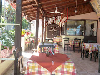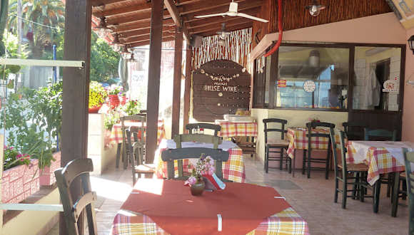Die Taverne wird vom Besitzerehepaar sehr herzlich geführt. Es wird dort zu sehr moderaten Preisen typisch griechische Tavernenkost und Fasswein aus eigener Herstellung serviert. Die Besitzerin spricht etwas deutsch und steht zusammen mit ihrem Mann in der Küche. Die Taverne liegt am unteren Ortsanfang rechts an der Hauptstraße tgl. 10-16 und ab 17 Uhr geöffnet Hauptgerichte 6-9 Euro