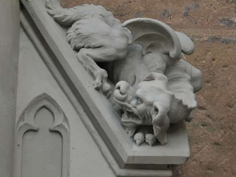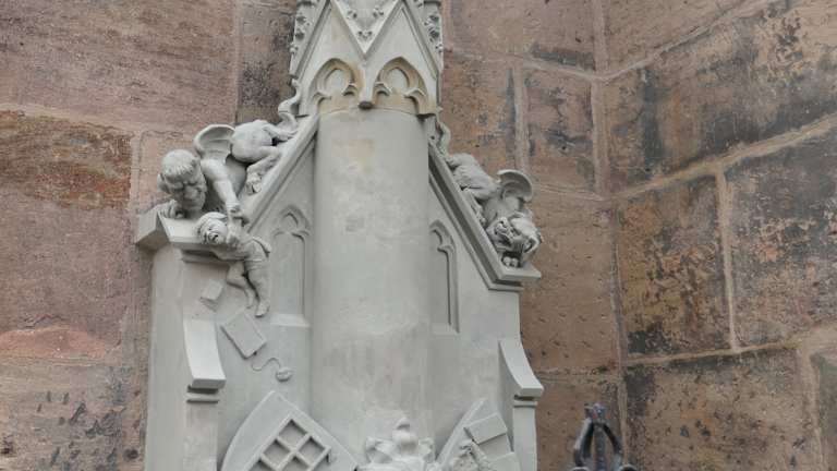 An der Außenwand der Lorenzkirche befindet sich das sogenannte Teufelsbrünnlein (nur wenige Meter vom freistehenden Tugendbrunnen entfernt). Obwohl das Teufelsbrünnlein recht interessant ist, wird es von den meisten leider übersehen, da sich der Blick auf die Lorenzkirche und auf den Tugendbrunnen richtet und man dabei das Teufelsbrünnlein nicht beachtet. Deswegen mein Tipp: gehen Sie vom Tugendbrunnen mal rüber zur Wand der Lorenzkirche und schauen Sie sich dort das Teufelsbrünnlein (mit dem Teufel, einem Drachen, dem schummelnden Murmelspieler / Schulbuben usw.) an.