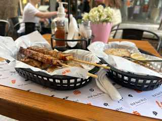 Kleine Tische auf der Fußgängerzone und Souvlaki mit Salat Geht schnell und ist gut und preiswert