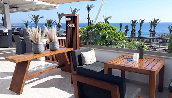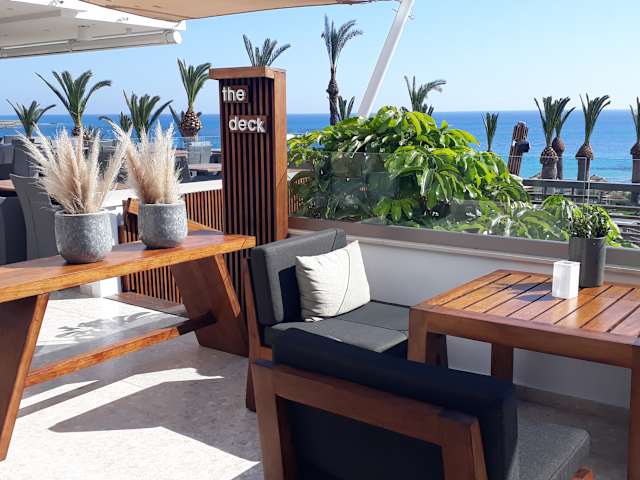 Das The Deck Restaurant und Bar ist Teil des Alion Beach Hotels, welches direkt an der Grecian Bay liegt. Von der Aussichtsterrasse aus überblickt man den gesamten Strandabschnitt bis hin zum Hafen Agia Napa. In der Happy Hour kann man bei einem Cocktail die Seele baumeln lassen und den Sonnenuntergang genießen. Leider gilt der Happy Hour Preis nur auf alkoholische Getränke und nicht auf Alkoholfreie, was zum Trinken verführt. Das Restaurant ist unterteilt in einen Raucher- und einen Nichtraucher Bereich.