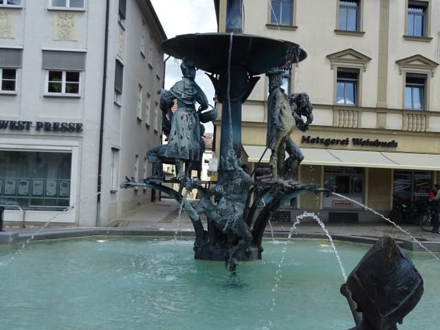 Der Marktbrunnen stammt offenbar aus dem Jahr 1987 vom Göppinger Bildhauer Kurt Grabert. Die Motive sollen wohl verschiedene Aspekte der Stadtgeschichte darstellen. Der aufwändige Brunnen mit seinen Figuren bietet auf jeden Fall viele tolle Fotomotive - sowohl im Gesamten wie auch die einzelnen Darstellungen.