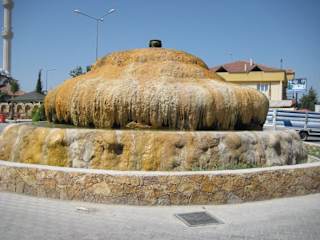 Karahayit liegt circa 5 km vor dem archäologischen Gebiet von Pamukkale. Es ist ein Dorf im Zeichen der Thermalwasser, ein kleiner Kurort - beliebt bei den Einheimischen. Dass das Dorf etwas mit Thermen zu tun hat, sieht man sofort, wenn man auf den großen Platz mit der beeindruckenden Moschee kommt. Direkt vor der Moschee steht ein sehr großer Brunnen - überzogen mit orangen Ablagerungen. die allerdings vom Brunnenerbauer so gestaltet wurden :-) Im Vergleich zu Pamukkale ist das Wasser in Karahayit sehr eisenhaltig. Dies bewirkt, dass die Felsen, usw. rötlich / orange schimmern, die wenigen Terrassen dunkelgrün. Eine ähnliche Brunnengestaltung findet man in einem noblen SPA-Hotel von Karahayit. Schön fand ich die große Moschee am Platz, in die ich sehr herzlich von einem davor sitzenden älteren Herrn gebeten wurde. Selbstverständlich habe ich sie mir angeschaut - auch von innen - obwohl gleichzeitig der eine oder andere Gläubige zum Gebet eintraf. Hat mich sehr gefreut, die Moschee betreten zu dürfen.