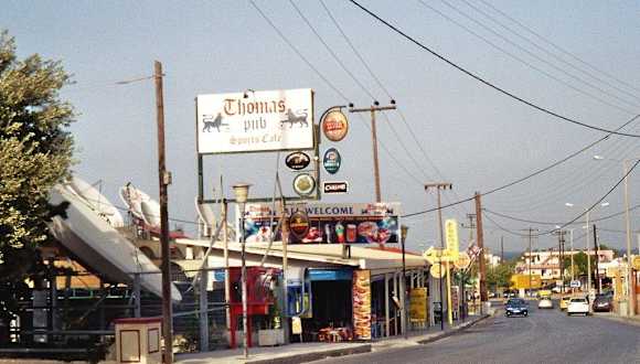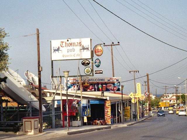 Das „Thomas Pub“ in Faliraki liegt, von der Hauptstraße aus gesehen, an der großen Straße ins Landesinnere, wo auch die Busse langfahren („Hotel Venezia“ ist in der gleichen Straße). Der Pub öffnet schon am frühen Vormittag; es gibt English Breakfast, Kaffee, Tee, Bier, Cappuccino, Coctails ect. (die Getränkeauswahl kann sich sehen lassen!); ein großer TV wird bei Bedarf für Sportübertragungen genutzt, ansonsten laufen Musikvideos. Rechts vom Tresen stehen in einem Extraraum eine Handvoll Computer (Internetcafé). Dort kann man in der Regel in Ruhe Internetsurfen – außer der Papagei hat „seine 5 Minuten“… Am Tage war der Pub immer recht leer, Abends „brummte“ der Laden. Er ist dann gut besucht durch hauptsächlich britische Gäste. Die Betreiber sind sehr freundlich, sprechen fließend Englisch. Die Preise im „Thomas Pub“ würde ich als „Zivil“ bezeichnen.