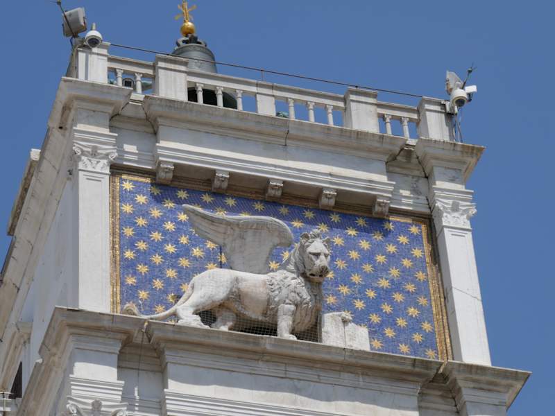 Hoch über dem Durchgang vom Markusplatz zur Altstadt ist der berühmte Torre dell Orologio im Stiel der Renaissance. Auf der großen Prunkuhr sind neben der Zeit, die Monate, die Mond- und Sonnenphasen sowie die Tierkreiszeichen angezeigt. Charakteristisch das sternenübersäte blaue Mosaikfeld und dem Markuslöwen im obersten Stockwerk. Zwei Mohren schlagen mit Hämmern auf der Plattform jede volle Stunde ein. Es ist schon ein besonderer Anblick!