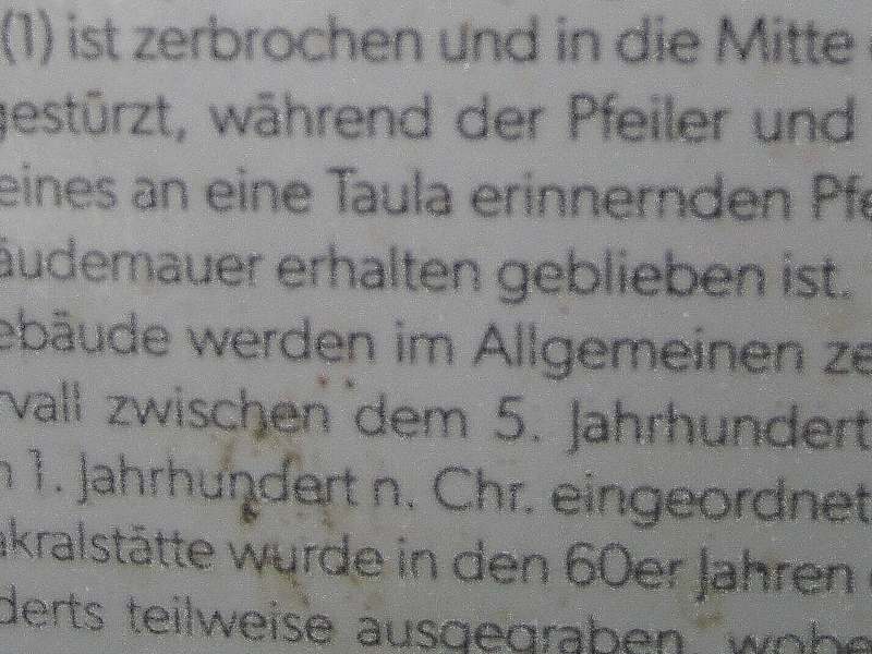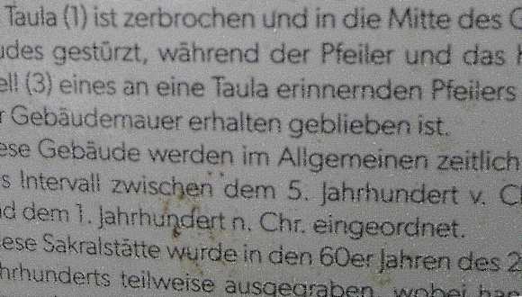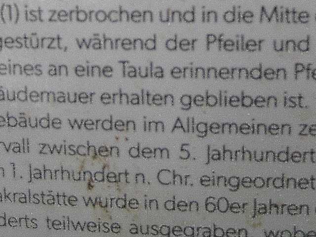 Man erreicht die Stätte Torrellafuda, indem man ab Ciutadella auf der Me-1 ca. 7 km Richtung Mahón fährt und dann rechts in die Straße Son Camps einbiegt. Man bleibt auf dieser Straße gut 500 m. Dort nach einem größeren Parkplatz Ausschau halten. Es ist der Parkplatz zur Stätte Torrellafuda, deren Eingang direkt gegenüber liegt. Nach Betreten der Stätte erreicht man nach wenigen Schritten ein fast kreisförmiges Areal mächtiger Steine. Die Bedeutung dieses Areals konnte ich leider nicht in Erfahrung bringen. Einige Schritte weiter sieht man linksseitig eine Höhle. Man kann hineinklettern. Es soll sich bei der Höhle um eine künstliche, um eine frühere Begräbnisstätte handeln. Ab diesem Weg – und schon ab dem Eingang – kann man den Talayot ausmachen, der wie auch das Taula-Heiligtum in einem Wäldchen liegt. Die Pfade dort sind ein wenig holperig. Sollte es zuvor länger oder heftig geregnet haben, ist etwas Vorsicht geboten. Klettert man dann zum Talayot hinauf, so bietet sich ab dort ein weiter Blick über die Landschaft. Die beim Talayot ursprünglich zu findenden Gebäude der talayotischen Siedlung existieren heute nicht mehr. Nicht allzu weit von Torellafuda entfernt soll es weitere sieben Talayots geben. Es wird davon ausgegangen, dass diese Türme auch als Wachtürme dienten, von denen vielleicht durch z. B. Rauchzeichen Warnungen, etc. übermittelt wurden. Der Talayot und die ursprüngliche talayotische Siedlung sind älteren Ursprungs als das Taula-Heiligtum. Talayot und Siedlung könnten (!) in die Zeit zwischen dem 9. und 6. Jh. vor Chr. eingeordnet werden (unterschiedliche Angaben in diversen Quellen). Das Taula-Heiligtum stammt lt. Infotafel vor Ort aus der Zeit zwischen dem 5. und 1. Jh. vor Chr. Zum Taula-Heiligtum: Man geht davon aus, dass es sich hierbei um eine Kultstätte (auch Opferstätte) handelte. Auf den ersten Blick vermutet man, dass das zu sehende mächtige T-förmige Monument die Taula ist, aber nein, ist sie nicht. Die Taula ist eingestürzt, einige ihrer gewaltigen Steine sind in der Mitte des Platzes zu sehen. Das T-förmige Monument wurde als ehemaliger Pfeiler + Kapitell der Taula identifiziert. Der Pfeiler hat - ohne das Kapitell - eine Höhe von ca. 1,90 - 2 m (siehe anliegendes Video). Zu der Stadtmauer der ehemaligen talayotischen Siedlung: Der interessanteste Teil der Mauer liegt unterhalb des Taula-Heiligtums am Ende einer Wiese. Der obere Teil der Mauer ist natürlich aus neuerer Zeit. Der untere Teil, darunter die zwei Tore, sollen hingegen „eindeutig aus prähistorischer Zeit / dem 3. Jh. vor Chr. stammen“ (Infotafel vor Ort). Was es mit dem kleinen „Fenster“ in der Mauer auf sich hat, weiß ich leider nicht. Sonstige interessante Info von vor Ort: Talayotische Siedlungen sollen im Allgemeinen keine Befestigungsmauern im eigentlichen Sinn gehabt haben – Ausnahmen Son Catlar (Ciutadella) und Torrellafuda… wobei die Mauer von Son Catlar das gesamte Dorf umgab, die Mauer von Torrellafuda an einer Steilklippe endete = natürliche Schutzbegrenzung. Der Besuch von Torrellafuda ist auf jeden Fall empfehlenswert und es war zur Zeit unseres Aufenthaltes nun wirklich nicht überlaufen – max. zehn weitere Besucher. Infotafeln alle auch in deutscher Sprache. (Eintritt frei.)
