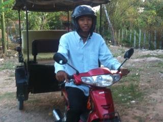 Der junge Kambodschaner Pheng hat uns an 3 Tagen, die wir im April 2012 in Siem Reap verbrachten, immer sehr zuverlässig an einem vereinbarten Punkt abgeholt, selbst bei strömendem Regen an einem Abend vor einem Restaurant, als wir wirklich nicht damit gerechnet hatten - befestigte extra für uns an seinem Tuk Tuk noch eine Plane gegen den starken Regen, damit wir unterwegs nicht naß wurden (und saß dabei selbst naß wie ein Pudel vorne auf seinem Moped...) … und brachte uns wieder zu unserem Hotel zurück. Für die Fahrt vom Borei ANGKOR Hotel in die Innenstadt von Siem Reap bzw. zurück hatten wir pro Strecke jeweils einen Dollar vereinbart. Termine hatten wir immer rechtzeitig etwa 30-60 min. vor der gewünschten Abholung mit ihm telefonisch vereinbart. Er freut sich sehr über Aufträge, und ist sowohl telefonisch (Tel. 092 208 727) als auch per eMail poukpheng@yahoo.com für Vorabbuchungen erreichbar. Pheng spricht recht gut Englisch, und konnte uns für unsere Weiterreise auch einen zuverlässigen Taxi-Fahrer vermitteln. Wir können ihn ohne Einschränkung empfehlen. Das abgebildete Foto hier entstand, als er uns auf der Taxifahrt zur Grenze noch ein Stück des Wegs mit seinem Moped begleitete.