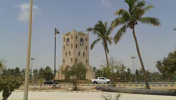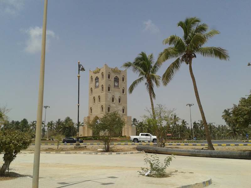 Auf einer Verkehrsinsel an einem Knotenpunkt des Straßenverkehrs in Salalah steht der weithin sichtbare Uhrenturm, dessen Baustil an historische Vorbilder arabischer Architektur erinnert.