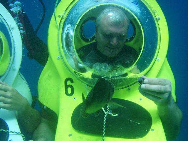 Man findet das Boot mit den 6 Tauchglocken im Hafen Puerto Colon. Es läuft zweimal am Tag aus und kostet zwischen 40-44€ pro Person. Man fährt aufs Meer raus dann werden die Scooter ins Wasser gelassen und man muss mit der Hilfe der Taucher in die Glocke eintauchen. Dann geht es auf ca. 8 Meter runter. Dort bekommt man was zum Fische füttern in die Hand. Dabei werden Bilder gemacht. Danach fährt man hinter dem Taucher her. Nach ca. 1/2 Stunde ist der Spaß leider schon vorbei und man fährt mit dem Boot wieder zurück zum Hafen. Man kann ein Video kaufen wo die eigenen Bilder und ein Video mit anderen Personen drauf sind, kostet 18€.