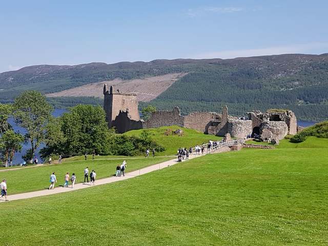 Am westlichen Ufer des Loch Ness, befindet sich die Burgruine Urquhart. Mit dem Bau dieser Anlage wurde um 1230 begonnen. Um zu dieser, wie ich finde schön gelegenen Ruine zu kommen, gibt es zwei Möglichkeiten: entweder mit dem Schiff über das Loch, oder über die Straße, welche dicht am Ufer des Sees verläuft. Wir selbst sind über die Landseite gekommen und fanden dort am Visitor Center einen großzügigen, kostenlosen, Parkplatz vor. Nachdem entrichten des Eintrittspreises, ging es abwärts. Entweder über eine Treppe, oder für Menschen, welche schlechter zu Fuß sind, mit dem Fahrstuhl. Als erstes führt der Weg linkerhand in ein kleines Kino, wo man in einem sehr informativen Film, etwas über die Geschichte der Anlage erfährt. Nachdem Ende der Vorführung sollte man der Aufforderung folgen und noch etwas sitzen bleiben. Die Vorhänge der großen Panoramascheibe öffnen sich und geben einen spektakulären Blick auf die Burg frei. Wie wir fanden ein kleiner "wow" Effekt. Man verlässt das Kino und begibt sich über eine Terrasse in den Außenbereich. Über Treppen, oder Wege begibt sich der Besucher nun zur eigentlichen Ruine, welche direkt am Ufer des Lochs erbaut wurde. Es kann alles auf eigene Faust erkundet werden. Schilder (in englisch) an vielen Stellen erklären die Bedeutung der einzelnen Bauten und Stellen. Es wird einem erst bewusst, wie groß diese Burganlage war, wenn man sie erkundet. Immer wieder gibt es neue Blickwinkel, sowie wunderschöne Blicke über den See. Nach einer ausgiebigen Besichtigung, kann man in dem obligatorischen Andenken Laden allen möglichen Schnickschnack erstehen. Auch ist ein kleines Selbstbedienungsrestaurant vorhanden. Wir haben dort einen Kaffee genossen und sind dann in Richtung Inverness gefahren, um am Clansman (wo man im Übrigen sehr gut essen kann) in ein Boot zu steigen und uns bei diesem Bootsausflug, die Ruine nochmal vom Wasser aus anzusehen. Ich (wir) finden diese Burgruine sollte man bei einem Ausflug nach Loch Ness nicht auslassen.