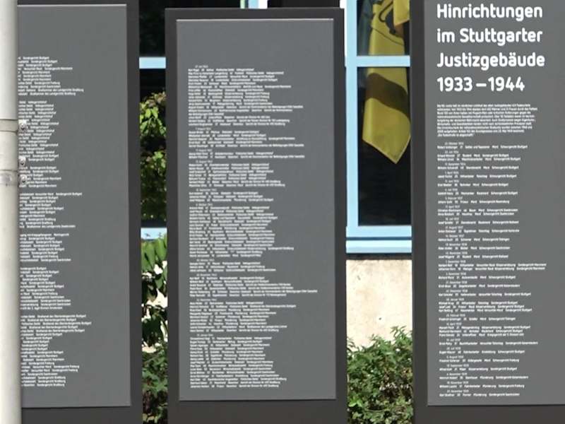 Vor dem Landgericht von Stuttgart, steht eine große Säule. Der Sockel besteht aus sechs verjüngenden Kalksteinquadern. An den Quadern ist der 1. Artikel der Verfassung des Bundeslandes Baden-Württemberg herausgemeißelt. Auf der Säule steht der Genius des Rechtsfriedens. Die Figur hält in der rechten Hand ein sogenanntes Liktorenbündel. Adresse: Kernerpl. 1, 70182 Stuttgart Geodaten: Q5MR+83 Stuttgart