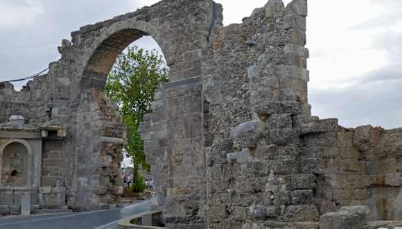 Eigentlich ist das nicht der Vespasian-Torbogen , denn einen solchen gibt es nicht. Dieser Torbogen nennt sich INNERER TORBOGEN. Da ich noch nicht in den Inneren Torbogen kommen kann, bewerte ich diesen Bogen als Inneren Torbogen. Es ist somit für die Touristen besser diese Strasse zufuß zu erobern, als mit der Bimmelbahn zu fahren. Dieser Zug hält nicht hier, er hält erst wenn er am Museum oder am Eingang des Theaters ist. Dieser Innere Torbogen war und ist ein Teil der Stadtmauer, die auch noch an anderen Stellen zu sehen ist. Die Kollonadenstraße oder Fahrstraße nennt sich auf türkisch "Liman Caddesi".