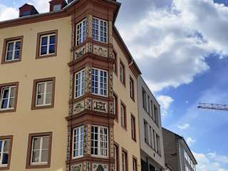 Ich fand es vor Ort ein wenig schwierig, die Häuser zuzuordnen, da (für mich) von unten die Erkerverzierungen nicht deutlich erkennbar waren. Somit habe ich ihnen zuerst einmal „neuzeitliche“ :-) Namen gegeben – nach z. B. den Geschäften, die sich heute in den Gebäuden befinden. Mit Hilfe der Fotos + Vergrößerungen war mir dann zu Hause die Zuordnung möglich: Das schöne Fachwerkhaus mit - auf dem Erker – Putten und Pflanzen, von mir auf dem Foto „zurzeitiges Pizza-Hut-Haus“ genannt, datiert von 1690 und überlebte den Zweiten Weltkrieg. Das Haus ist laut Infotafel vor Ort bis heute ohne Namen. Das zweite schöne Fachwerkhaus mit unten am Erker dem Hl. Petrus und von mir das „zurzeitige Schmuckkontor-Haus“ genannt, stammt von 1691. Der heutige Name lautet laut Infotafel vor Ort: "Zu Sankt Petrus". Das von mir „Wolsdorff-Zigarren-Haus“ benannte Haus mit den Arkaden und einem grünen Baum auf dem Erker wurde 1692 erbaut. Der Arkadengang wurde erst 1950 zum Schutz der Fußgänger hinzugefügt, da am Haus seit 1899 die Straßenbahn um die Ecke fuhr. Der heutige Name lautet laut Infotafel vor Ort: "Zum Grünen Baum". Bleibt das „Eierstockhaus“ (so auch dort auf einem Schild zu lesen): Dort befand sich von 1689 bis 1848 die Hauptwache – erkennbar an z. B. der Kanone auf dem Erker. Der heutige Name lautet laut Infotafel vor Ort: "Hauptwache". Alle vier Häuser hatten Vorgängerbauten (von 1608), die allerdings im Pfälzischen Erbfolgekrieg zerstört wurden. 1944 wurden dann drei Häuser erneut zerstört – Ausnahme (s. o.) das Fachwerkhaus mit den Putten und Pflanzen. Die Häuser sind an der Kreuzung der Straßen Am Plan - Löhrstraße - Altengraben – Marktstraße zu finden. Quelle: koblenz.de (Stadtleben & Kultur / Stadtporträt)