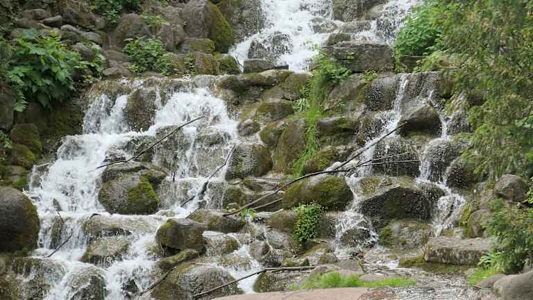 Park mit Kreuzberg, Wasserfall und Denkmal