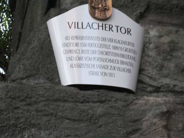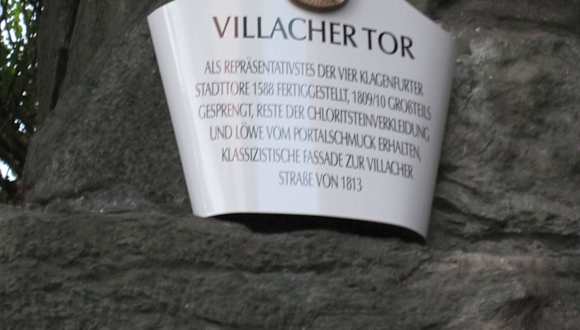 Viel ist von dem ehemals so mächtigen Tor der historischen Stadtbefestigung von Klagenfurt nicht erhalten. Aber man kann einen Eindruck davon bekommen. Die Stadtbefestigung stammt aus 1558 und wurde 1809 von den Truppen Napoleon gesprengt. In der Villacherstr. 2 sieht man noch Teile des einst so wichtigen Tores mit Erinnerungsplakete.