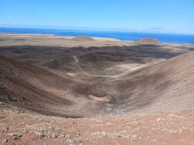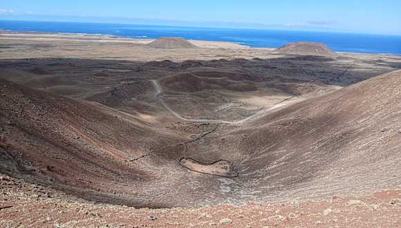 Den Vulkan kann man über eine Fahrpiste direkt vom Hotel erreichen. Der erste Teil der Wanderung über die Ausfallstraßen ist eher öde, danach wird es sehr einsam. Über einen sehr gut ausgebauten Weg geht es zu einer Aussichtsplattform, von wo aus man in den Krater schauen kann. Man muss zwar kein Gipfelstürmer sein, aber Wanderschuhe und ein bisschen Trittsicherheit sind erforderlich. Man kann den Weg bis nach Lajares ausdehnen (von dort bis Bus oder Taxi zurück) oder auf gleichem Wege wieder zurück ins Hotel.