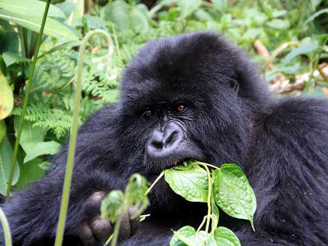 Im Dreiländereck Ruanda/Uganda/Demokratische Republik Kongo befindet sich der Parc National des Volcans. Dieser wurde in den vergangenen Jahren leider immer wieder verkleinert, wodurch der Lebensraum der letzten Berggorillas immer enger wird. Ausgangspunkt ist die Stadt Musanze/Ruhengeri, von dort fährt man auf bester Straße ~11 km bis zum Hauptquartier Kinigi. Um 7 Uhr ist hier Treffpunkt, dann werden maximal 8 Touristen in einer Gruppe eingeteilt. Ungefähr 7 Gorillafamilien (ändert sich, da die Tiere über die Landesgrenzen wandern) können besucht werden. Die größte ist die "Susa" mit ~40 Tieren. Sie ist am interessantesten, aber auch am schwierigsten zu erreichen. Mit dem eigenen Auto und Führer fährt man ~2 Stunden in Richtung Gisenyi. Kurz vor der Stadt biegt man auf eine schlechte Straße ein, an einem Kontrollpunkt ist die Fahrt zu Ende. Von dort geht es ~40 Minuten zu Fuß bis zum Beginn des Nationalparkes, von hier nochmals 2-3 Stunden bergauf zur "Susa-Familie". Der Eintrittspreis beträgt 750 USD und man ist eine Stunde bei den Tieren. Es bietet sich an, für 10 USD einen Träger fürs Tagesgepäck zu nehmen, es ist angenehmer zu laufen. Der Weg geht durch dichtes Gestrüpp, Brennnesseln, Dornen, ... weshalb Handschuhe, langärmlige Hemden und dickere Hosen von Vorteil sind. An die Gorillas kommt man bis auf wenige Meter ran, sie haben keinerlei Angst, fotografieren kann man bestens. Auch wenn die Tour nicht gerade billig ist, sie ist auf jeden Fall absolut lohnenswert!