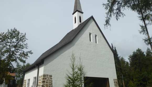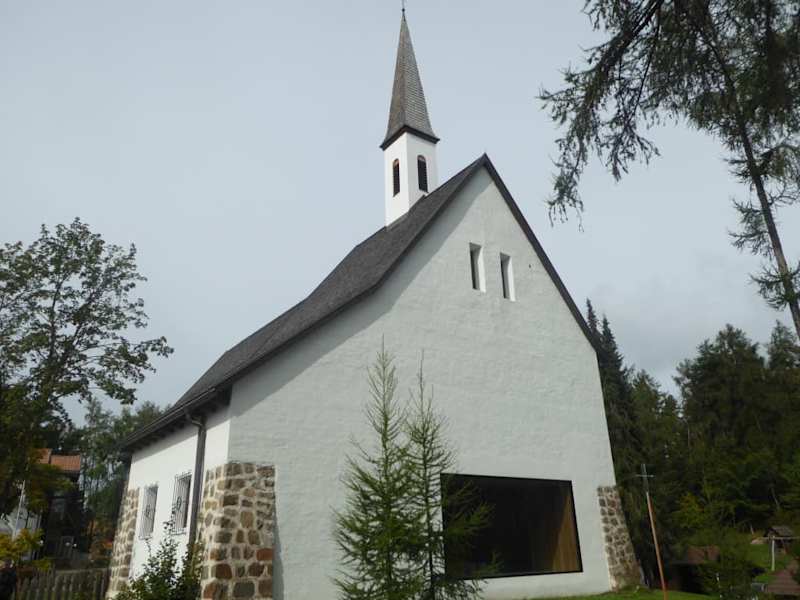 Bei unserer Wanderung entlang der Freudpromenade kamen wir auch bei der Waldkirche zum hl.Josef in Lichtenstern vorbei. Die Waldkirche gehört zum Bildungszentrum Haus der Familie. Das Bildungszentrum Haus der Familie besteht aus drei Häusern – dem Haupt, Wiesen-und Waldhaus und der Waldkirche. Die Rittner Waldkirche wurde zwischen 1953 und 1955 mit einfachen Mitteln gebaut und in den letzten Jahren wurde die Kirche von Grund auf erneuert. Der neue Altar befindet sich in der Mittelachse des Kirchenraumes. Die technische Ausstattung wurde bei der Renovierung auf dem aktuellsten Stand gebracht. Wie man im Internet nachlesen konnte, wurde die Ostfassade von einer großzügigen rechteckigen Öffnung durchbrochen um dem Innenraum mehr Tageslicht zu verleihen. Der gerahmte Blick nach außen ist geprägt von der sich wandelnden Landschaft im Laufe der Jahreszeiten. Sehr gut gefielen mir, die zwei Buntglasfenster mit den Darstellungen des Hl.Stephans und der Hl.Notburga. Die Buntglasfenster stammen vom Meraner Künstler Peter Fellin. Die Neugestaltung der Kirche hat rund 800.000 Euro gekostet. Ein Teil davon wurde durch Spenden von Freunden und Gönnern des Hauses der Familie aufgebracht. Bei der Weihe im Jahr 2017 hat Bischof Ivo Muser eine Reliquie des seligen Josef Mayr-Nusser (1910 -1945) in den neuen Altar eingesetzt. Im Jahr 1944 wurde Josef Mayr-Nusser ein katholischer Laie zur SS einberufen. Einen Tag vor der Eidesleistung erklärte er, dass er den Eid aus Gewissensgründen nicht leisten könne. Josef Mayr wurde in Danzig wegen „Wehrkraftzersetzung“ zum Tode verurteilt und sollte in Dachau erschossen werden. Auf dem Weg dorthin ist Josef Mayr am 24. Februar 1945 in Erlangen in einem Viehwaggon seinen Strapazen erlegen.Er gilt als Südtiroler Leitfigur des Widerstands gegen die NS-Unrechtsherrschaft und ist Ehrenbürger der Stadt Bozen. Im Juli 2016 hat Bischof Ivo Muser die Nachricht erhalten, dass Papst Franziskus durch seine Unterschrift bekräftigt hatte, dass Josef Mayr-Nusser am 18. März 2017 selig gesprochen werden kann. Am 18. März 2017 fand im Bozener Dom die Seligsprechung statt. Der Gedenktag von Josef Mayr-Nusser ist der 3.Oktober, der Vortag seiner Eidesverweigerung. Eine sehenswerte moderne Kirche die man bei der Wanderung entlang der Freudpromenade auf jeden Fall besichtigen sollte. Schräg gegenüber der Kirche auf dem Wanderweg befindet sich eine Panoramatafel mit Beschreibung der gegenüberliegenden Berggipfeln von den Dolomiten. Man hat hier einen herrlichen Fernblick in die Berglandschaft der Dolomiten. In unmittelbarer Nähe der Kirche auf der Freudpromenade befindet sich auch ein Bild Denkmal von Anna und Sigmund Freud von 1913.