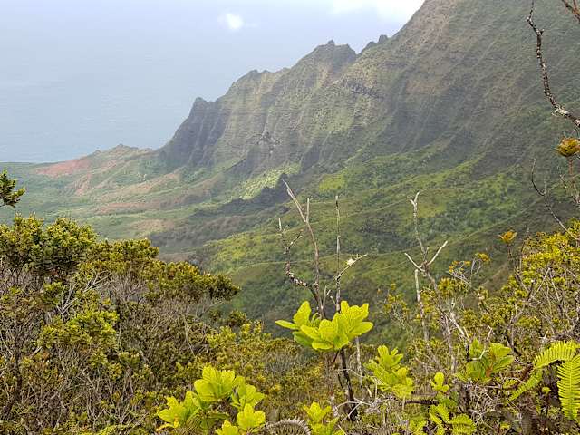 Der Kalalau Trail ist 18 km lang und führt oberhalb der Klippen der Na Pali Coast entlang. Wer bis zum Ende des anstrengenden Weges gehen will, muss dort zelten. Dazu benötigt man eine Genehmigung des State Park Office. Wer das nicht will, der kann die Tagestour ins Hanakapi'ai Valley unternehmen. Verpflegung und Getränke müssen mitgenommen werden. Wir haben uns 1996 und nun 2014 an diesem Trail versucht und sind beide Male nach wenigen Meilen abgebrochen, da es geregnet hat und der Weg zu glitschig wurde. Trotz Wanderschuhen wurde es eine Rutschparty. Aber scon die ersten Meilen waren schön und wir hatten einige schöne Ausblicke.
