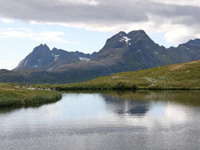 Die Wanderung auf den Ryten fand ich einen der Höhepunkte meiner Lofoten-Reise. Nicht zu anstrengend aber sehr aussichtsreich. Man fährt mit dem Auto bis Fredvang und folgt der einzigen Straße Nr. 986 nach links in Richtung Krystad noch ca. 1 Kilometer weiter, bis man auf der rechten Seite ein Wohnhaus mit einer norwegischen Flagge auf dem ach sieht. Außerdem ist an die Hauswand noch eine weitere norweg. Fahne gemalt, die man aber nur sieht, wenn man von der anderen Seite der Straße kommt. Bei dem Haus kann man auf der Straße parken. Der Wanderweg beginnt, wenn man ein paar Meter die Straße in Richtung Fredvang zurückgeht und zwar dort, wo ein Fichtenwäldchen beginnt. Vor dem Fichtenwald sieht man einen ausgetretenen, unbezeichneten Pfad, der entlang des Wäldchens über eine Wiese sanft aufwärts auf einen Hügel führt. Nach ca. 20 Minuten ist der Hügel erreicht und man sieht rechts einen weiteren Pfad, der in Richtung Fredvang führt. Man folgt aber dem Wanderweg, der links hinter einem kleinen See weiter nach oben führt. Von hier hat man schon sehr schöne Ausblicke auf Yttersand und das Meer. Nach einer weiteren halben Stunde gelangt man zu einer Art Almhütte. An dieser muss man sich rechts immer bergauf halten in Richtung des 543 m hohen Gipfels des Ryten, den man über einen Wiesenpfad, der stetig nach oben führt nach ca. einer weiteren halben Stunde erreicht. Von hier hat man grandiose Ausblicke auf den Kvalvika Strand. und die dahinter liegenden Berge. Wenn man wieder zurück in Richtung der Almhütte absteigt, sieht man rechter Hand einen weiteren See. An diesem geht man rechts hinunter zum Kvalvika Strand. Bei Ebbe kann man auch noch zu einer weiteren Bucht gehen. Wir sind aber am ersten Strand über den Skoren Paß ( ca. 40 Minuten bergauf und noch mal 30 Minuten bergab) wieder zurück zur Straße gewandert. Wenn man die Straße erreicht, muss man dieser noch ca 10 Minuten zu Fuß folgen , bis man wieder am Parkplatz angekommen ist.