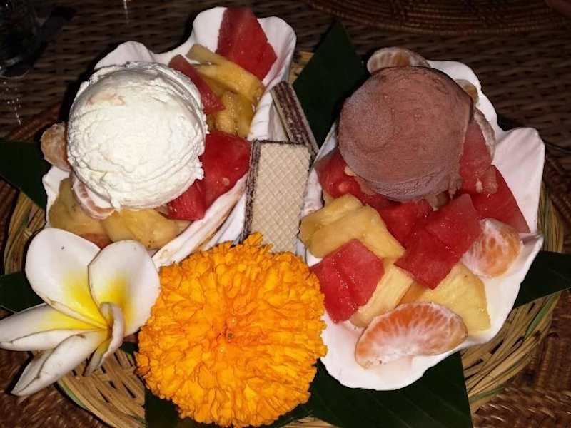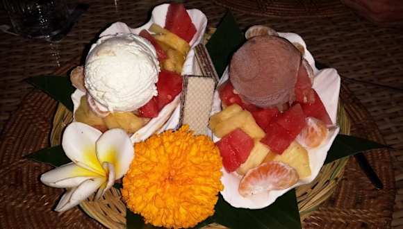 Wir waren zum Abendessen und für einen Kochkurs im Warung Bambu. Gegessen haben wir bestimmt 3 Mal dort. Es war immer absolut super. Ein Traum ist die Rijstafel, dort bekommt man insgesamt 9 verschiedene Gerichte, weißen und gelben Reis und Saté-Spieße. Die Qualität der Speisen ist absolut top. Wir wissen es - wir haben ja hinter die Kulissen geguckt, als wir den Kochhkurs gemacht haben. Selbst das Wasser (gibt es übrigens kostenlos) wird mit Frischhaltefolie abgedeckt gekühlt. Der Kochkurs war total lustig. Selbst meinem Freund hat es wirklich Spaß gemacht ;-) Wir haben um 8 Uhr angefangen und begannen mit einem Trip zum Markt in Singaraja. Ein interessantes Erlebnis ;-) Dann fing der Kochkurs an. Am Vorabend konnten wir uns unser eigenes Menü zusammenstellen. Daher kochten wir zunächst einmal Frühlingsrollen mit süß-saurer Soße. Danach ging es weiter mit Hühnchencurry, Nasi Goreng mit Seafood, Mie Goreng vegetarisch und Saté-Spieße. Zum Nachtisch gab es Dadar (glaube das es so hieß ;-D), also grüne Pancakes mit Palmzucker und Kokosnuss gefüllt. Wir bekamen außerdem die Rezepte von allen Gerichten. Am Ende durften wir alles verspeisen :-) Suuuper lecker! Die Preise sind etwas höher, als der Durchschnitt. Dafür ist die Qualität und der Geschmack der Speisen absolut super und das Geld wert!