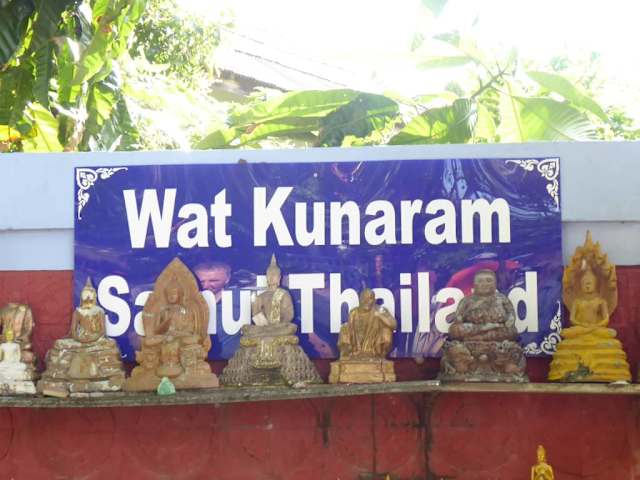 Natürlich geht der Mythos um vom Mumifizierten Mönch , also haben wir uns auf unser Mofa geschwungen und haben ihn aufgesucht . Er befindet sich in einer kleinen Wat Anlage unweit vom Lamai Beach , die Wat Anlage nennt sich " Wat Khunaram " ( Wat heißt Tempel und im Anhang ist dann immer die jeweilige Tempelanlage ) . Man betritt jeden Wat immer durch ein schönes Tor , so kann man eigentlich die Wat Anlagen nicht verfehlen . Kurz nach betreten sieht man schon eine große Glasvitrine in der sich der Mönch befindet , der Mönch lebte von 1894 - 1973 und sei nach Aussage der Mönche wehrend der Meditation verstorben . Er befindet sich immer noch in seiner Meditationsübung man hat ihn in eine Vitrine gesetzt und die Sonnenbrille dient dazu das Kinder nicht vor dem Anblick seiner Augen erschrecken . Es ist wie gesagt nur eine kleine Tempel Anlage mit einem recht schönen kleinem Tempel und einem Friedhof im Garten mit einigen Buddha Figuren . Aber dennoch ein Besuch wert. Als kleinen Tipp , man kann den Ausflug kombinieren mit Hin Ta & Hin Yai der ebenso am Lamai Beach liegt .