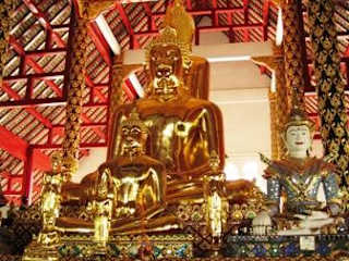 Dieser Tempel ist sehr außergewöhnlich. Hier gibt es sehr viele kleine, weiße Chedis in denen die adligen Familien der Stadt begraben wurden. Ein sehr großer weißer Chedi strahlt vor dem blauen Himmel. Im Tempel gibt es viele schöne Buddhafiguren und unser Führer hat uns die Geschichte von Buddha anhand thailändischer Schriften erklärt. Dieser Tempel soll einer der wichtigsten hier vor Ort sein.