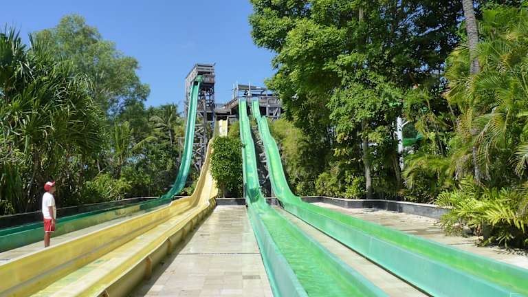 Wir haben zum Ende unseres Aufenthalts auf Bali einen Tag im Waterbom Park verbracht und waren begeistert. Wir waren direkt morgens zur Eröffnung des Parks da, sodass wir alle Rutschen ausprobiert hatten bevor man sich überhaupt anstellen musste. Jede Rutsche verfügt über eine Bewertung in 3 Kategorien, sodass man ungefäht weiß, was auf einen zukommt. Am gesanntesten war ich vorab auf die Rutsche "Climax" die über einen Looping verfügt. Man steht oben in einer Kammer, in der sich die Klappe öffnet und mann zunächst im freien Fall nach unten rutscht bevor es in den Looping geht. Generell ist hier der Nervenkitzel vor dem ersten Rutschen um einiges schlimmer als das Rutschen selbst ;) Es gibt zudem einige Reifenrutschen, eine Mattenrutsche und die üblichen Rutschen. Ich empfehle einen Besuch der Homepage des Parks, auf der man sich Videos der Rutschen ansehen kann. Kosten: Eintritt: umgerechnet ca. 25€ Essen im Park: sehr gut und günstig (gebratene Nudeln mit Getränk für ca. 6€, Pizza + Getränk für ca. 8€). Bezahlungssystem: Im Park bezahlt man mit einem "Splash Band". Dort kann man Geld draufladen und alles im Park bezahlen. Im Park gibt es mehrere Stellen, an denen man seinen Kontostand kontrollieren kann und einen Stand, an dem man sein Band aufladen kann. Wenn man was gekauft hat bekommt man immer einen Kassenbon, auf dem der neue Kontostand vermerkt ist - Super System! Überall im Park werden Bilder gemacht. Wenn man fotografiert wird, bekommt man ein Bändchen mit einer Nummer. Die Bilder kann man sich am Fotocounter zeigen lassen und kaufen (wie immer in solchen Parks ziemlich teuer).