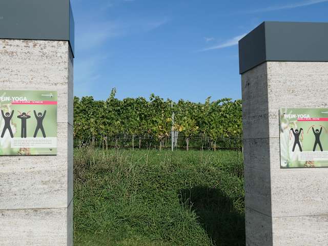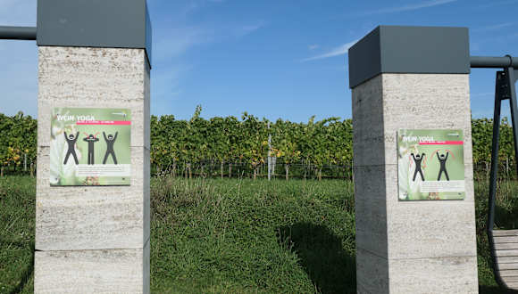 In den Weinbergen oberhalb von Sommerach stehen in der Nähe des Aussichtsturm zwei sogenannte Wein-Yoga-Schaukeln. Man kann hier entspannt schaukeln und den Blick über die Weinberge schweifen lassen – Voraussetzung ist jedoch, dass nicht auch andere die selbe Idee haben, denn es sind wie gesagt nur zwei dieser Wein-Yoga-Schaukeln. An den Pfosten der Schaukeln sind zudem Schautafeln mit „Wein-Yoga-Übungen“ angebracht.