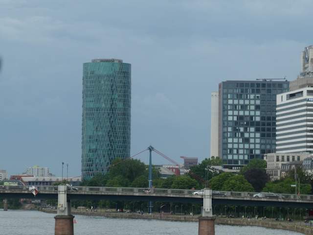 Abseits von den anderen Hochhäusern in Frankfurt befindet sich der Westhafentower am Westhafen. Sein Aussehen mag sicherlich an ein Apfelweinglas erinnern, weshalb die Frankfurter ihm auch als „größtes Apfelweinglas der Welt“, oder kurz als „Geripptes“ bezeichnen (ein Geripptes ist ein Apfelweinglas). Von den Mainbrücken und vom Mainufer auf der Sachsenhausener Mainseite hat man einen schönen Blick zum Westhafentower.