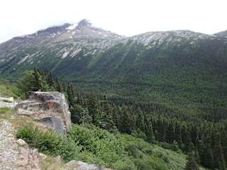 Eine der Touristenattraktionen von Skagway ist die Schmalspurbahn White Pass & Yukon Route, mit der man derzeit von Skagway bis Carcross fahren kann. Früher wurden auf dieser Trasse gut betuchte Schürfer zu den Goldfeldern in Yukon transportiert. Die anderen mussten sehen, wie sie auf Schusters Rappen oder mit dem Pferd zum Ziel kamen. Jetzt werden Touristen in nostalgischen Eisenbahnwaggons durch eine spektakuläre Landschaft befördert. Im Rahmen eines Tagesausfluges nutzten wir die Bahn zwischen Fraser und Skagway. Wie früher auch bei uns, hatten die Wagen an beiden Enden ein offenes Perron mit einer Treppe zum Aus- und Einsteigen, das darüberhinaus aber auch perfekt zum Fotografieren geeignet war. Der Kanonenofen im Wageninneren musste nicht benutzt werden, da wir bestes Sommerwetter hatten. Die eng beieinander stehenden -extra für die Touristen gepolsterten- Sitze boten größeren Reisenden nur extrem wenig Beinfreiheit. Gleich zu Beginn der Tour erhielten wir eine Broschüre mit Erklärungen zur Bahnfahrt und dies sogar in mehreren Sprachen. Die Strecke führte auf rumpeligen Gleisen entlang enger Schluchten und reißender Gletscherflüsse, durch dunkle Tunnels und über abenteuerlich wirkende Brückenkonstruktionen. Zu sehen waren dunkle oder auch lichte Wälder mit allerlei Blumen, schneebedeckte Berge und rauschende Wasserfälle. Ein Reisebegleiter kommentierte die Fahrt auf Englisch und erzählte vom Goldrausch und von den Glücksrittern, für die die Strecke gebaut worden war. Die Fahrt ist eine schöne Abwechslung, aber kein "Muss".