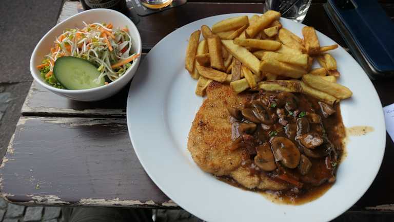 Bei unserem Aachen-Besuch waren wir auch einmal beim Wirtshaus am Hühnerdieb zum Abendessen. Es war Montag und Montag ist hier beim Wirtshaus am Hühnerdieb Schnitzeltag. Es waren noch einige Tische im Freien vor dem Wirtshaus frei und so ließen wir uns an einem dieser Tische nieder. Wie gesagt, es war Schnitzeltag und so bestellten wir uns jeweils ein Schnitzel. Die Schnitzel waren gut und die Portionen waren mehr als ausreichend. Obwohl es sehr touristisch war, waren die Bedienungen überaus freundlich und zuvorkommend, jedoch keinerlei aufdringlich.