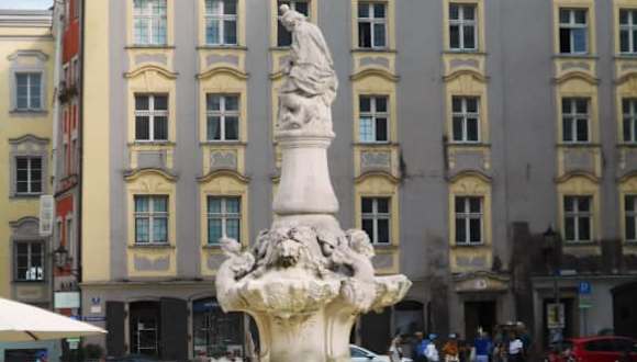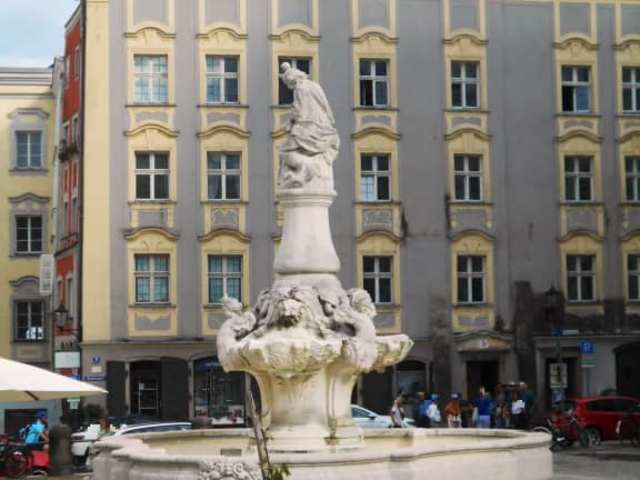 Eigentlich ist der Brunnen ein Denkmal. Er wurde 1903 zur 100 jährigen Zugehörigkeit zu Bayern erschaffen. Er wurde im barocken Stil gebaut und zeigt Maria auf einer Säule. Drei kleine Engel gruppieren sich um sie. Sie sind Symbole der Drei-Flüsse-Stadt, Donau, Ilz und Inn.