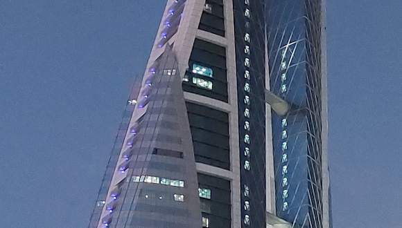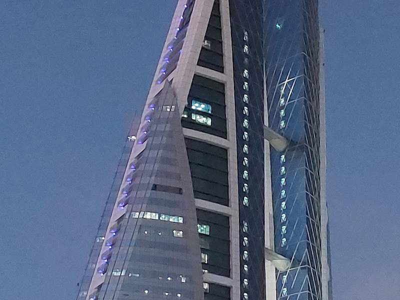 Das bekannteste und auch bemerkenswerteste Gebäude in Manama ist zweifelsohne das Bahrain World Trade Center (BWTC). An den 3 Querstreben zwischen den Türmen sind Windräder befestigt und daher ist das BWTC das erste Hochhaus der Welt mit einer integrierten Windkraftanlage. Insgesamt verteilen sich auf beide Türme jeweils 50 Etagen auf 240 Metern. Für Publikum zugänglich ist nur das Einkaufszentrum "Moda Mall" im Untergeschoss. https:// www. bahrainwtc. com