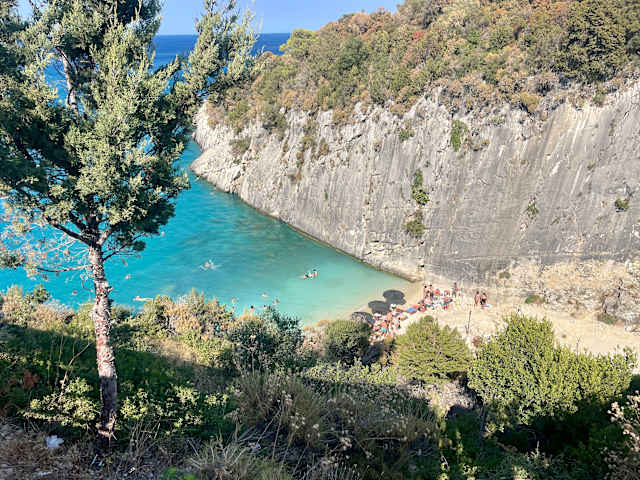 Karibikfeeling auf Zakynthos bei diesem Schwefel-Strand. Wunderschönes Meer, allerdings sehr schmaler Strand und viele Leute. Schwefelgeruch unterschiedlich intensiv. Hier kommen auch die Griechen her um im Schwefelwasser zu baden (scheinbar gut bei Hautproblemen). Wenn man den Weg wieder hochläuft, gibt es auch ein Restaurant mit super Aussicht