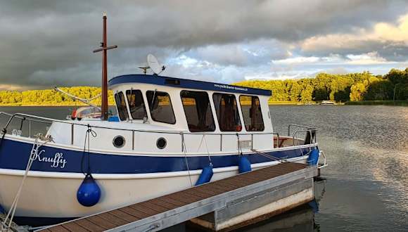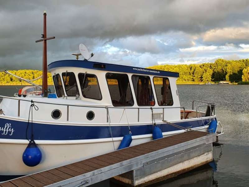 Wir haben erst Anfang Juli, also schon mitten in der diesjährigen Hauptsaison, die Idee gehabt, einen ersten Versuch mit einem Hausboot oder so zu starten. Unsere Anfrage konnte Familie Naumann positiv beantworten, denn sie boten uns "Knuffij" an, den wir schon am 09.07.20 für eine Woche übernahmen, nachdem uns Hr. Naumann jun. umfangreich und geduldig einerseits in die Miniyacht einwies und andererseits uns mit den Notwendigkeiten und Inhalten eines Charterscheins vertraut machte. Inklusive Probefahrt nahm das zwar ganze drei Stunden in Anspruch, machte uns aber viel Spaß... Was sollen wir sagen?! Knuffij erwies sich als absoluter Glücksgriff! Wir hatten nicht nur eine tolle Woche auf den Seen rund um Wesenberg & Fürstenberg weil es landschaftlich so schön ist, sondern auch weil das kleine Boot alles hatte, was man für eine autarke Woche benötigt. Es war in einem tadellosen Zustand und sehr sauber und nicht nur gut ausgestattet, sondern ist auch mit Wärme eingerichtet. Sämtliche Tanks entsprachen den Zusagen, wir brauchten in der ganzen Woche keine Nachbetankungen. Besonders praktisch erwies sich der auch mit Gas zu betreibende Kühlschrank - er ermöglichte uns, uns nahezu jede Nacht eine romantisch-einsame Anlegestelle zu suchen, da wir auf Stromzufuhr nicht angewiesen waren. Darüber hinaus ist es aufgrund seiner Maße einfach zu fahren. Knuffij kann man außerdem wirklich lieben, denn der Name ist tatsächlich Programm! Das Boot zieht liebevolle Aufmerksamkeit auf sich, wenn man anderen auf dem Wasser oder in Schleusen begegnet. Oft blieben Leute am Ufer stehen und sahen der knuffigen Miniyacht hinterher... Dass das Boot eine nachträglich angebaute Badeplattform erhalten hat, ist eine besondere Freude! Sowohl Übergabe wie Rückgabe des Bootes verliefen einwandfrei und konfliktlos. Familie Namann erwies sich als absolut fair und korrekt und überaus freundlich. Ein von uns verursachter Schaden an der Inneneinrichtung wurde mit einer wirklich geringen Pauschale abgegolten und alles war gut. Wir können Yachtcharter Naumann daher nur wärmstens weiter empfehlen und würden uns selbst immer wieder für Wasser-Urlaub ab Strasen entscheiden! Der Plan für einen weiteren Urlaub mit einem Hausboot/Floss oder einer kleinen Yacht von Naumann steht bereits! Leute - zögert nicht!