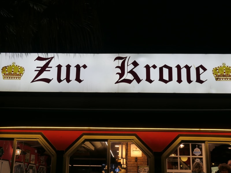 Das Lokal „Zur Krone“ befindet in S'Arenal / Platja de Palma in der Carretera de l'Arenal 43. Die Krone ist ein besonders bei Deutschen beliebtes Lokal. Wir waren hier am Abend zu einem Absacker. Da es ein kühler Abend war, suchten wir uns einen Platz im Innenraum. Aber die Krone verfügt auch über Sitzmöglichkeiten vor dem Lokal. Das Lokal Zur Krone ist nur durch die Carretera de l'Arenal von der Strandpromenade und vom langen Sandstrand getrennt.