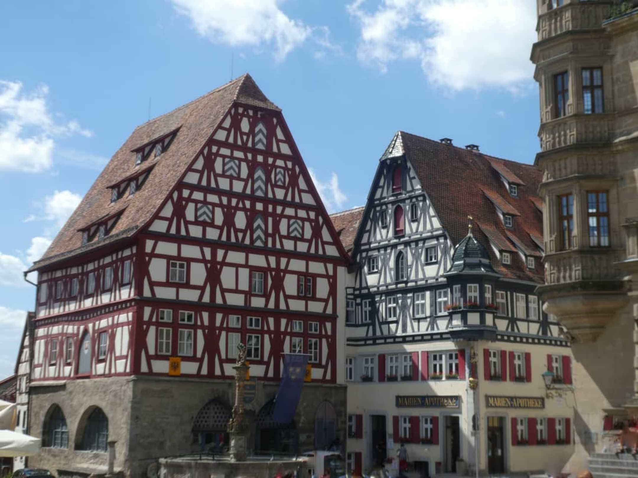 Links: das Fleisch- und Tanzhaus in Rothenburg