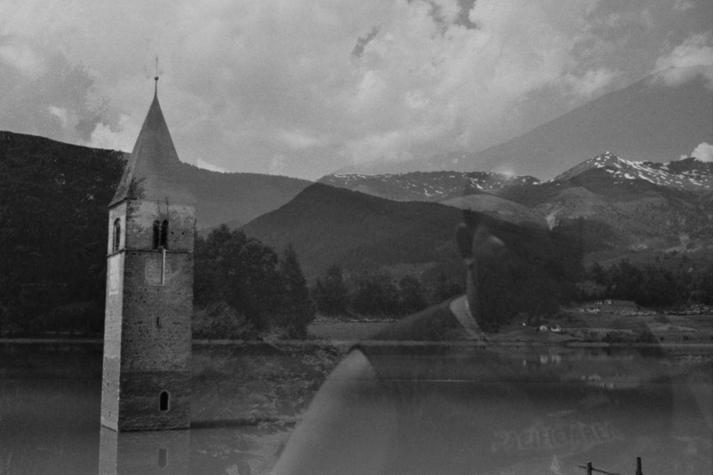 Reschensee in Schwarz/Weiß