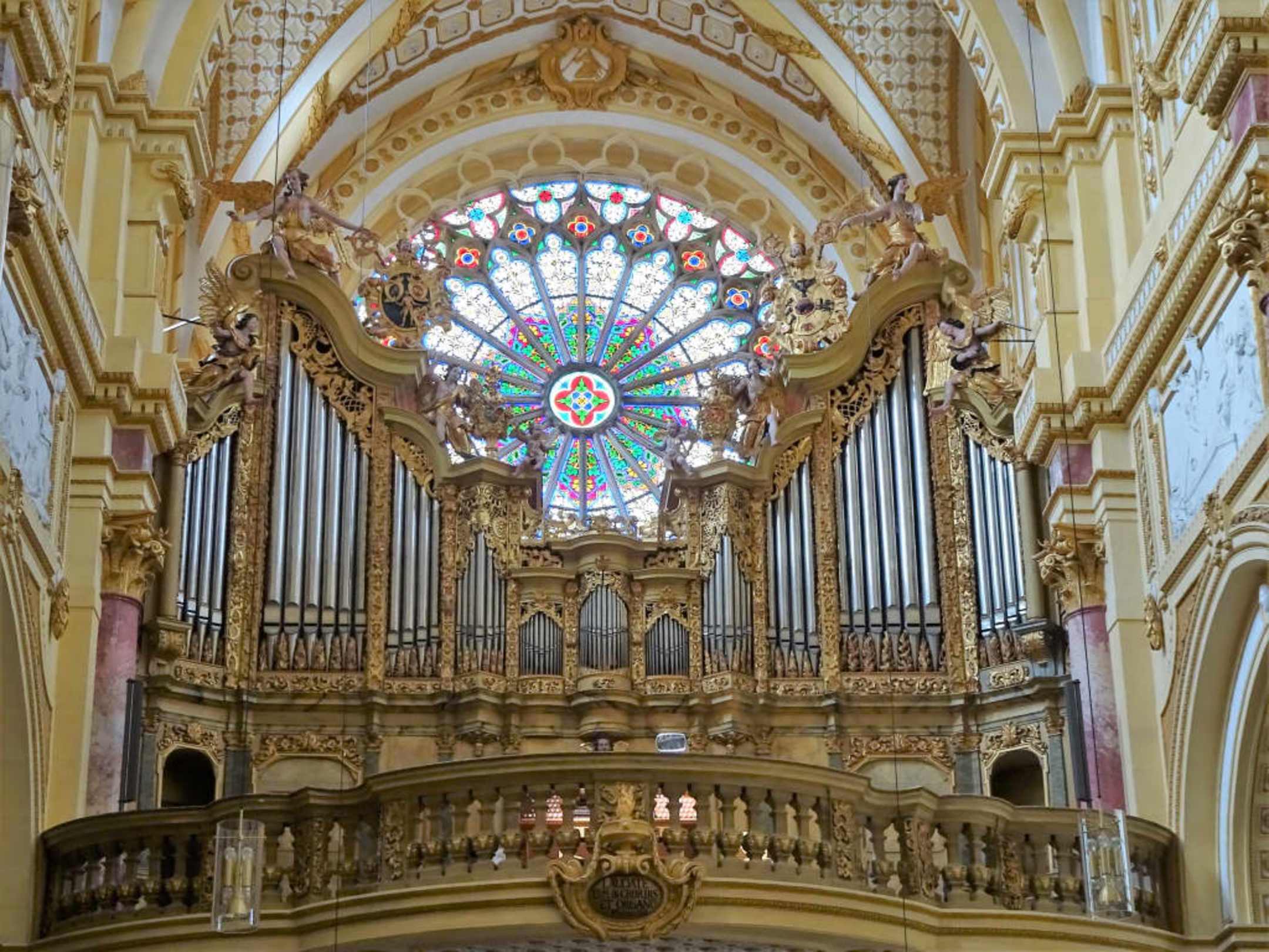 Blick auf Orgel und Fensterrose der Abteikirche