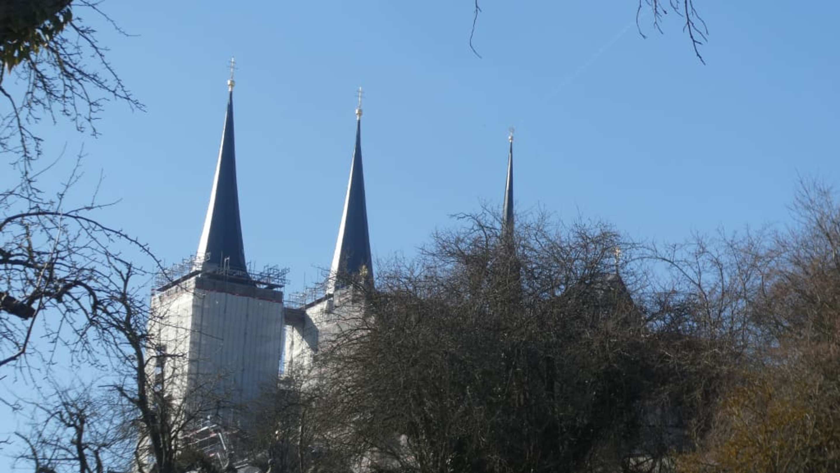 Die eingerüsteten Türme der Kirche Michelsberg